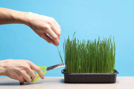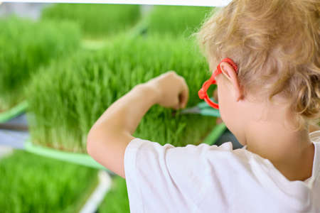 Rear view of a blond boy who is cutting grass. Child with scissors cuts sprouted grains of green wheat on a micro-greenery farm