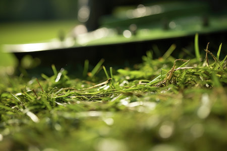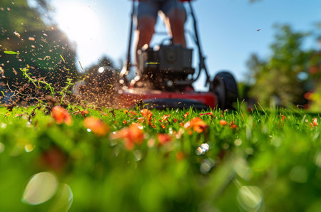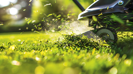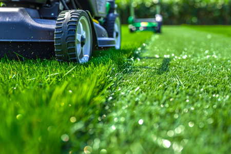 A lawn mower glides over the rich, verdant grass, leaving a crisp line in its wake. The sun shines brightly, illuminating the lush blades and creating a refreshing summer atmosphere.