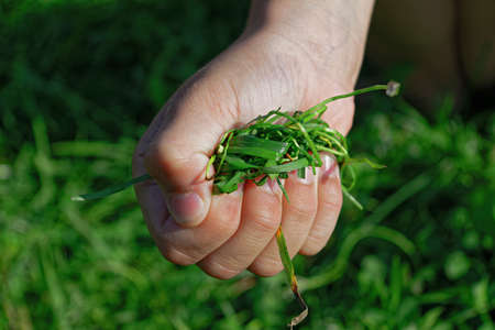 woman is tearing up the grass in the garden with a sickle close-up. concept agriculture