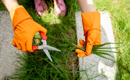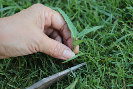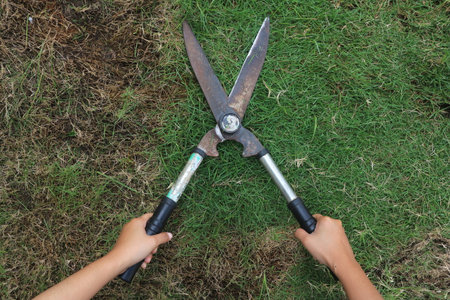 a mans hand mows the lawn with scissors, the concept of cutting and mowing the lawn