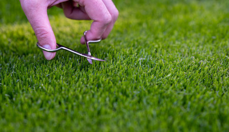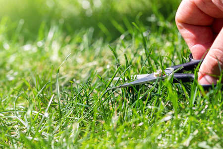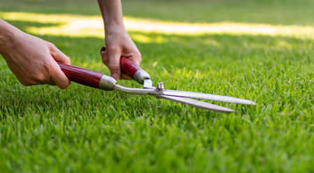 Close-up detail view of man hand cutting green grass on backyard garden with small nail scissors on bright summer sunny day. Accurate perfect lawn mowing care maintenance and service concept