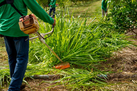 Mowing green grass using a fishing line trimmer. Application trimmers.