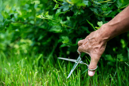 Hand with vintage scissors cutting stems quisetum arvense, field horsetail or common horsetail in a meadow in summer among medicinal herbs in an ecologically clean region