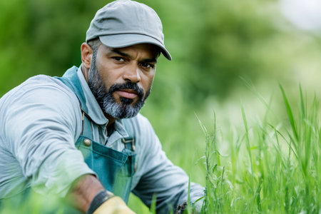 Focused Gardener Working in Vibrant Greenery with Determined Expression.