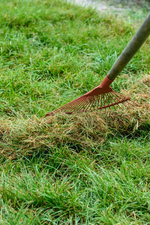 Cleaning of garbage and dry grass from the lawn with a fan rake