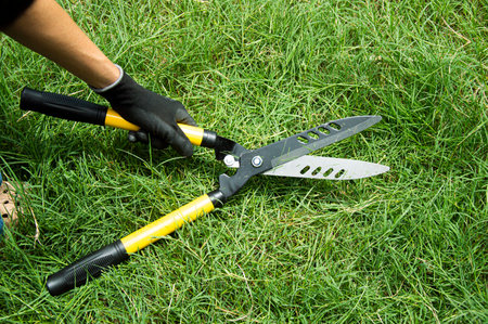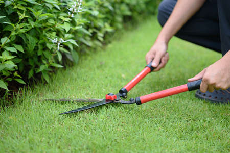 Hands holding the gardening scissors on green grass. Gardening concept background.