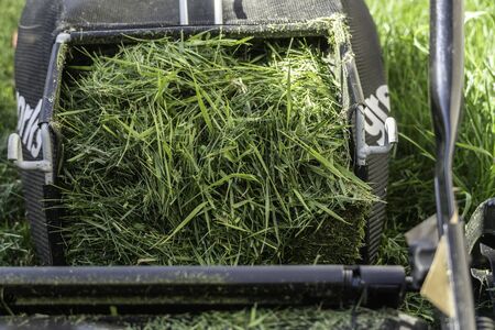 Mowing a lawn with a lawn mower. Garden work concept background.