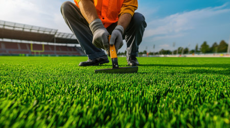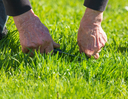 Close-up Of A Man Using Measuring Scale While Cutting Grass With Scissors