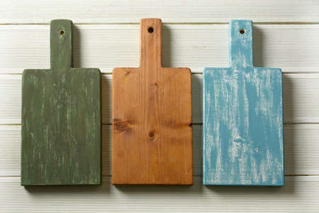 Wooden chopping boards on light background