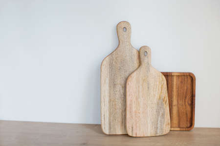 Wooden cutting kitchen Board, isolated on wooden table background. Top view.