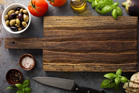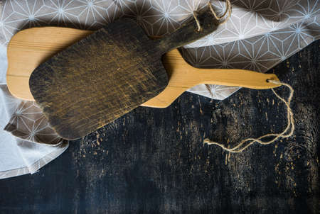 Cooking concept with vintage cutting board and napkin on old wooden table with copyspace