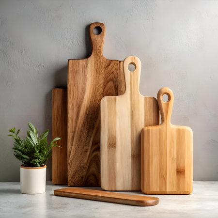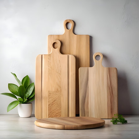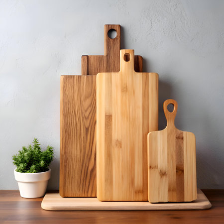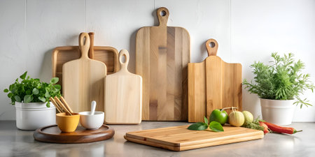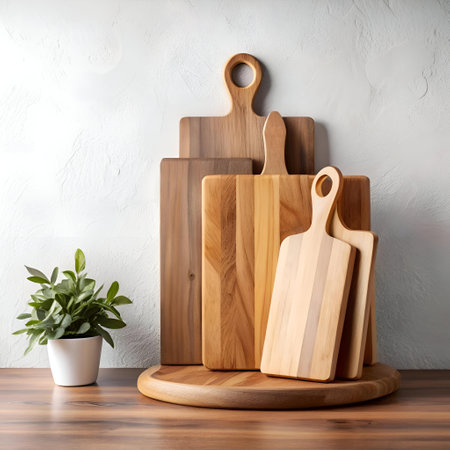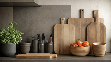 A stylish kitchen scene featuring wooden cutting boards and utensils arranged neatly on a countertop with vibrant plants, creating a warm and modern atmosphere.
