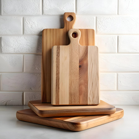 A set of three wooden cutting boards. arranged in a stack against a white brick background. The boards are made from natural wood and feature a beautiful grain pattern. This image is perfect for promoting kitchenware. healthy eating. or adding a touch of rustic charm to your designs.