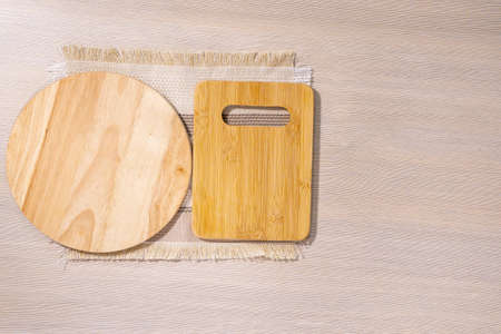 wooden cutting boards on a light background with space for copying text. flat lay
