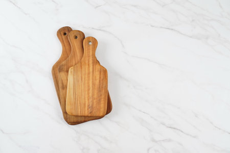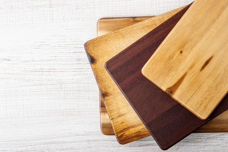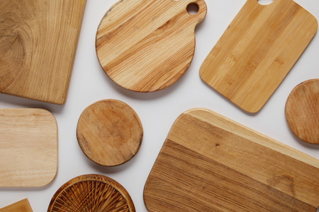 top view of various wooden cutting boards on white table
