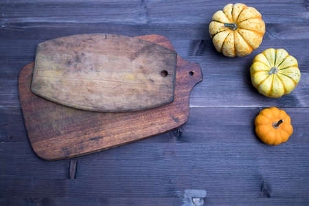 Orange pumpkins and leaves, top view on the brown wooden background , web banner with copy space in cutting board