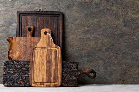Set of wooden chopping cutting boards on a light background. Handmade Charcuterie style serving boards. manual work. place for text, top view.