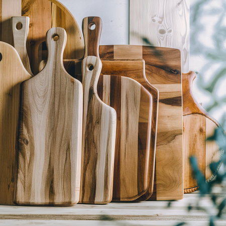 A beautiful collection of wooden cutting boards. perfect for showcasing your culinary skills or adding a touch of rustic charm to your kitchen decor. These versatile boards come in various sizes and styles. ready to be used for chopping. serving. or displaying your culinary creations.