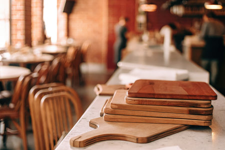 Wooden cutting boards on the table in a cafe or restaurant.