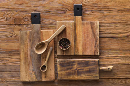 Cutting boards, bowl with peppercorn and spoons on wooden background