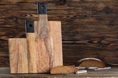 cutting boards and bread on wooden background