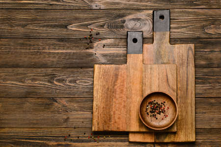 Cutting boards and bowl with peppercorn on wooden background