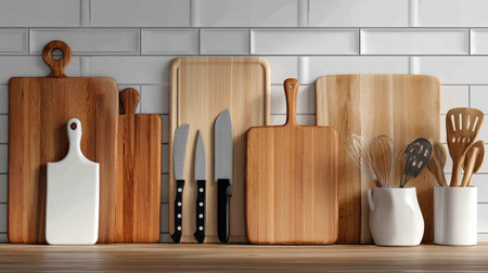 A stylish arrangement of wooden cutting boards and knives on a kitchen counter against white tiles, showcasing culinary tools and modern kitchen aesthetics.