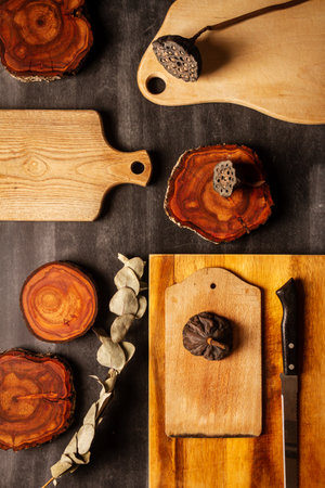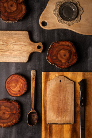 Wood log tree slices and cutting boards on black background. Flat lay. Top view