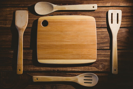 Directly above shot of chopping board with wooden utensils