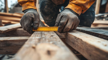 A close-up view of a home renovation, highlighting a carpenter measuring a wooden plank with a tape measure.