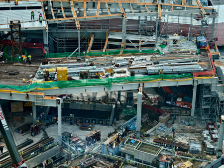 High angle view of a construction site with cranes and workers working