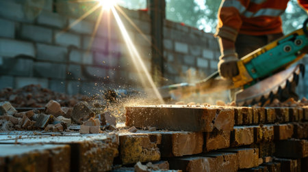 A construction worker operates an electric saw on bricks, creating dust and sparks in an industrial setting. Sunlight rays enhance the scene.