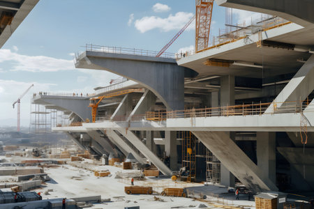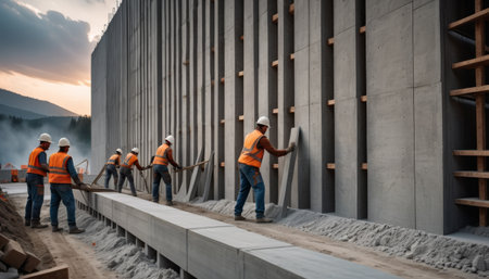 Workers in safety gear smooth freshly poured concrete at a construction site, showcasing teamwork and precision in a structured setting. AI Generation