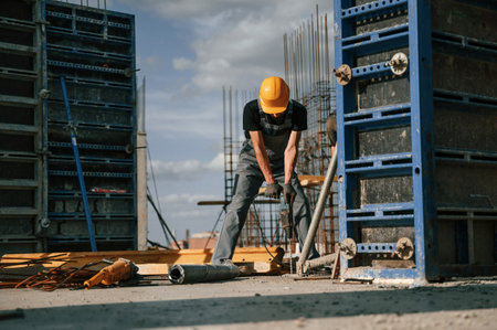 Using the drill. Man in uniform is working on the construction site.