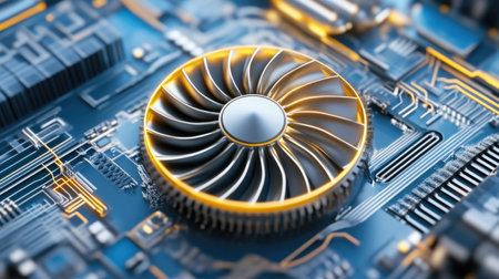 Computer cooling fan for overclocking on a circuit board, close up; Computer technology.