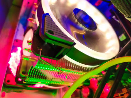 Modern computer air cooling with multi-colored led backlight-fans, cooling radiators, cables, boards, close-up.