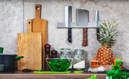 Kitchen countertop with cooking utensils, green salad bowl, cutting boards, spice grinders, magnetic knives, fruits on tray. Concrete backdrop. Healthy eating, cooking, food blogging background