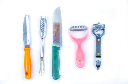 knife and kitchen ware on white background