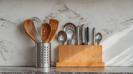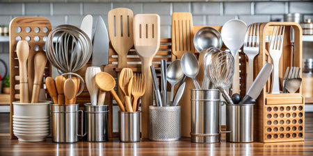 Culinary Arsenal: A symphony of stainless steel and bamboo kitchen utensils stand ready for culinary action, promising delicious creations.