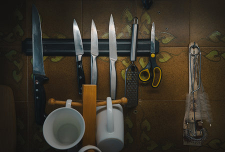 Kitchen knives and other accessories on a magnetic strip on the wall with decorative tiles.