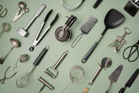 Flat lay of metal kitchen utensils and cookware