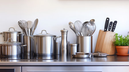 A stylish kitchen counter showcasing an array of cookware and utensils, featuring pots, pans, and kitchen tools in modern stainless steel. Perfect for culinary enthusiasts.