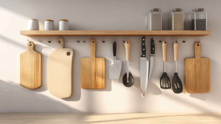 A beautifully arranged display of wooden cutting boards and kitchen utensils on a modern shelf, showcasing a clean and organized culinary space with a bright atmosphere.