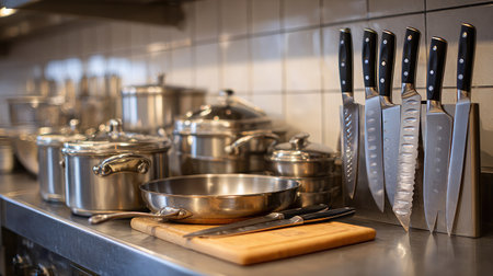 A well-organized kitchen workspace featuring stainless steel pots and professional kitchen knives, designed for efficient food preparation and culinary excellence.