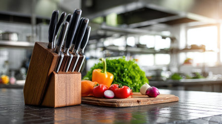 A modern knife set sits elegantly in a wooden block on a kitchen counter, accompanied by fresh vegetables, showcasing an inspiring culinary atmosphere for cooking enthusiasts.