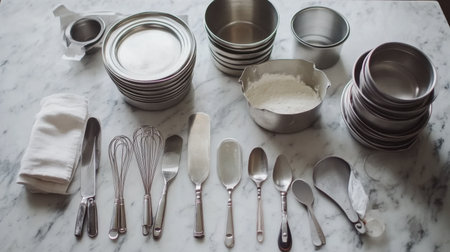 A well-organized collection of kitchen utensils and cookware, including mixing bowls, measuring tools, and baking supplies arranged on a stylish marble countertop, ready for culinary tasks.