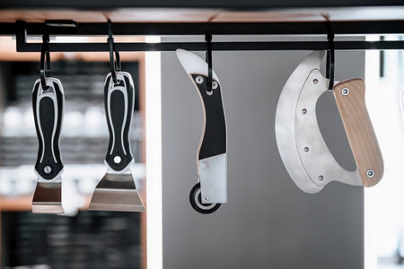 Various specialized tools for stretch ceiling installation hanging on display in a hardware store, featuring metal blades and ergonomic handles.