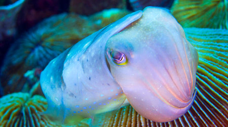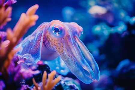 Close up capture of a cuttlefish among coral reef showcasing vibrant underwater life