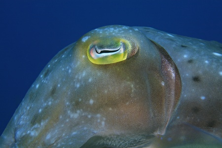 Close up of a Common cuttlefish in an aquarium on blue background. Sepia officinalis species living in the Mediterranean Sea, North Sea, and Baltic Sea or South Africa. side view
