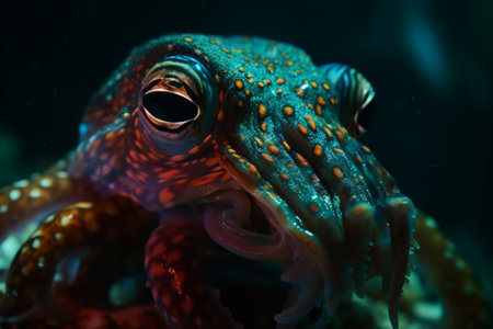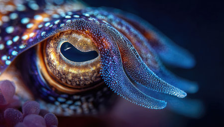 This macro shot reveals the intricate details of a marine animal's eye and tentacles, showcasing a captivating blend of colors. The image is marked by a dark background, contrasting with bright blues, oranges, and purples. Its composition could be suitable for scientific publications or illustrative purposes.